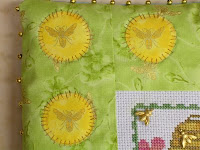 And my bee charms off of ebay arrived today. I also changed the french knots I had for the flower centers into just a backstitch, the knots looked too messy. The only part I'm not happy about is the bottom where I had to hand stitch it to close it off. I have yet to figure out the invisible stitch (where the stitch is hidden inside the seam) so it looks sloppy to me because the thread shows on the outside.